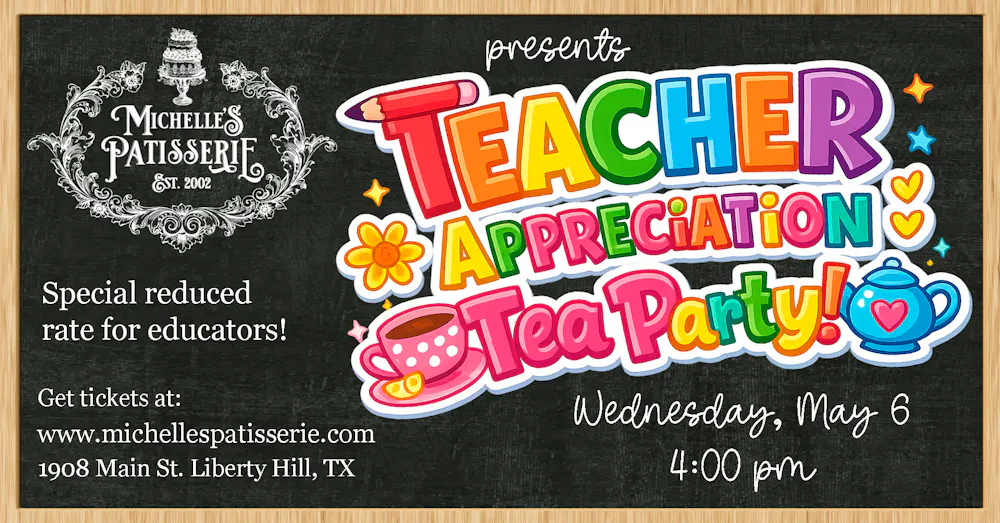 | April Teas Sun, Apr 19 National Tea Day Celebration Wed, Apr 22 Fri, Apr 24 Sun, Apr 26 Wed, Apr 29 | May Teas Fri, May 1 Farmyard Friends Tea & Petting Zoo Sat, May 2 Sun, May 3 Teacher Appreciation Tea 4:00 pm Wed, May 6 Fri, May 8 Mother's Day Tea Sat, May 9 Wed, May 13 | May Teas Fri, May 15 Sun, May 17 Wed, May 20 Fri, May 22 Sun, May 24 Wed, May 27 Fri, May 29 Sun, May 31 |